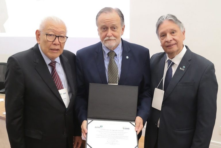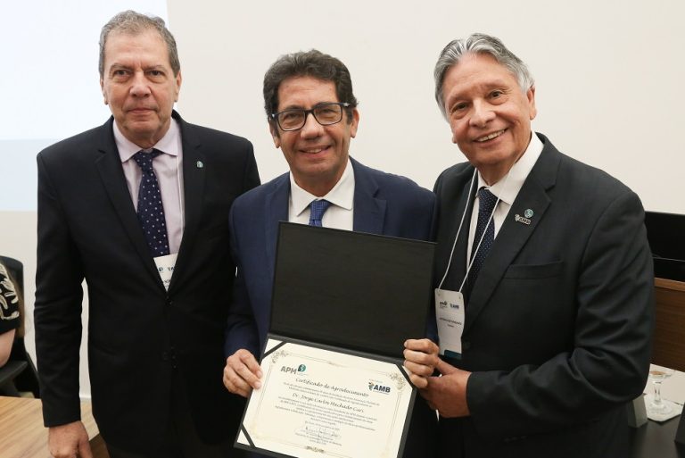 “Essa questão dos avanços tecnológicos, medicamentos etc. é muito bem-vinda, mas precisa ser conciliada com essa humanização na relação com os pacientes que nós temos que preservar. Eu aprendi uma coisa aqui nessa casa, que mantendo a diversidade das nossas Associações, Conselhos e Sindicatos, poderíamos manter essa união dos médicos, e essa força política de preservar essa Medicina. Ameaças continuarão existindo, mas temos que nos manter unidos, até com as nossas diferenças, para preservar essa missão”, discursou Curi, que recebeu seu certificado de agradecimento de João Sobreira de Moura Neto, vice-presidente da APM.